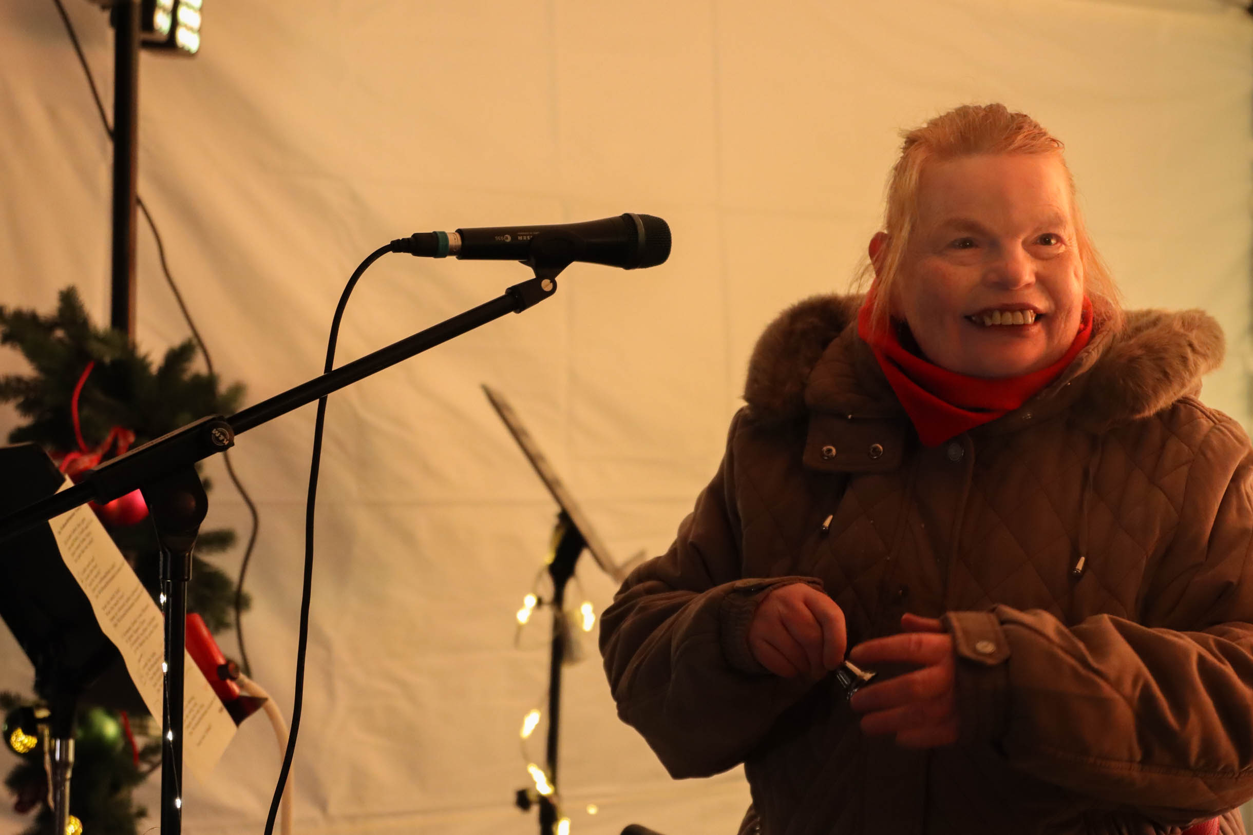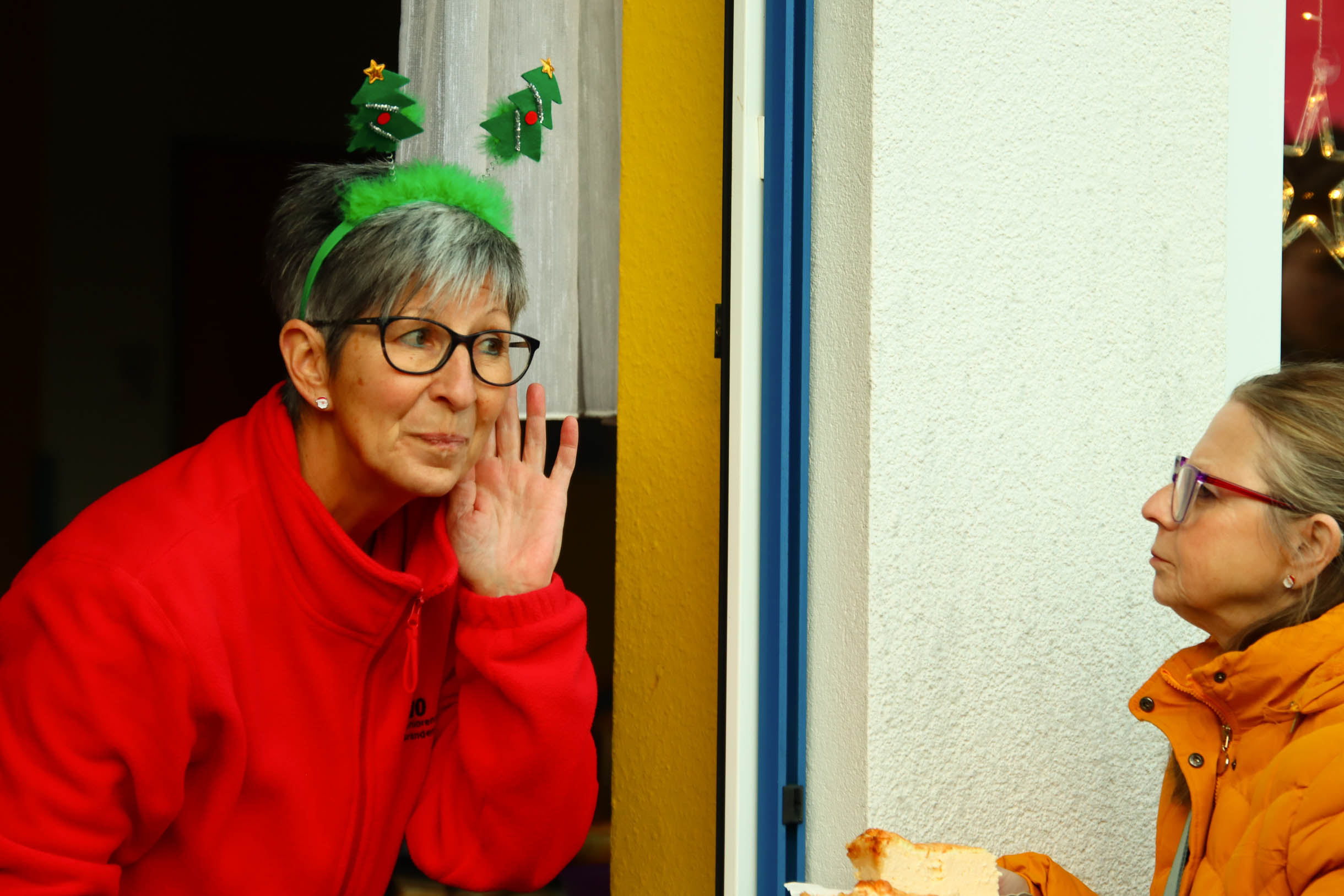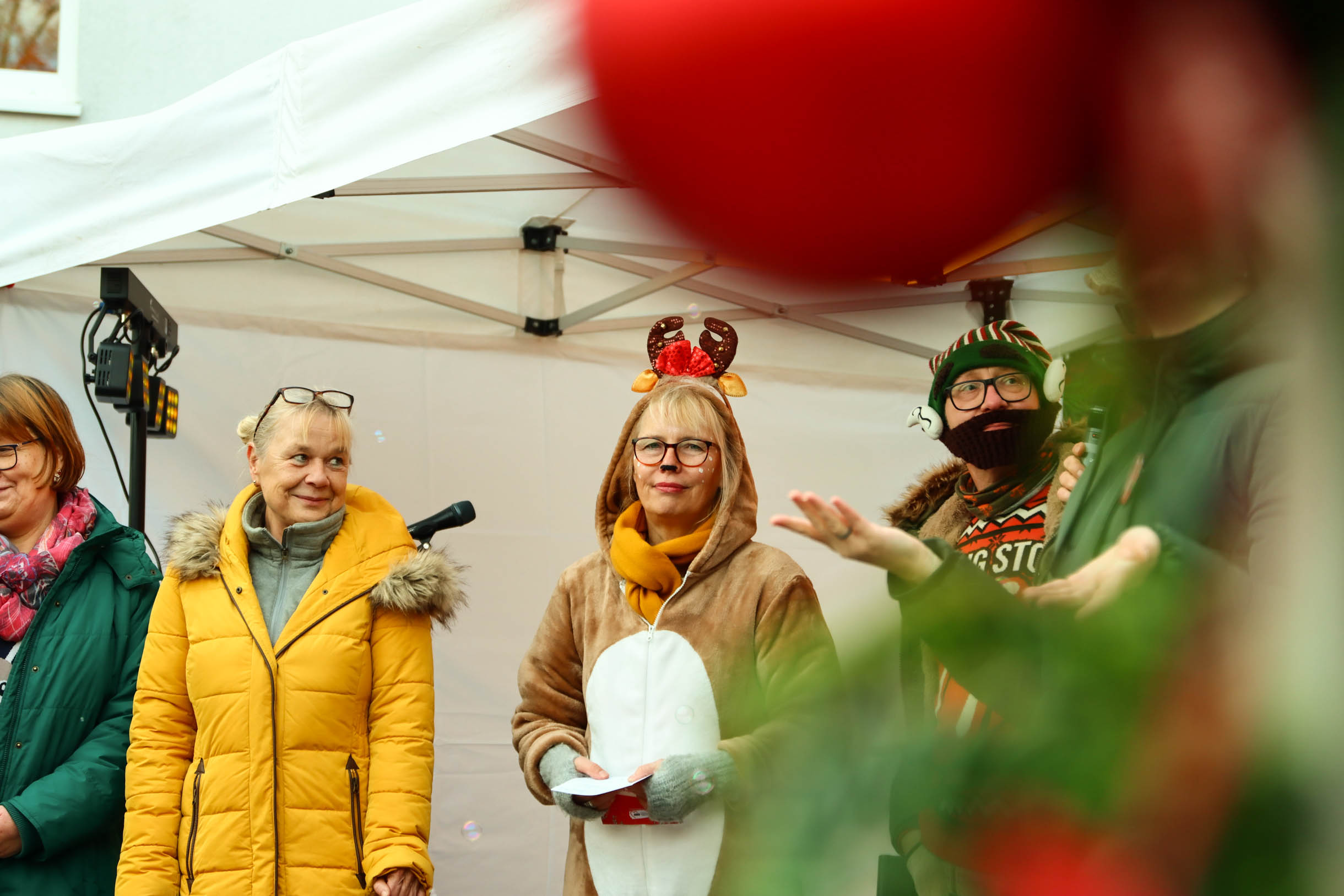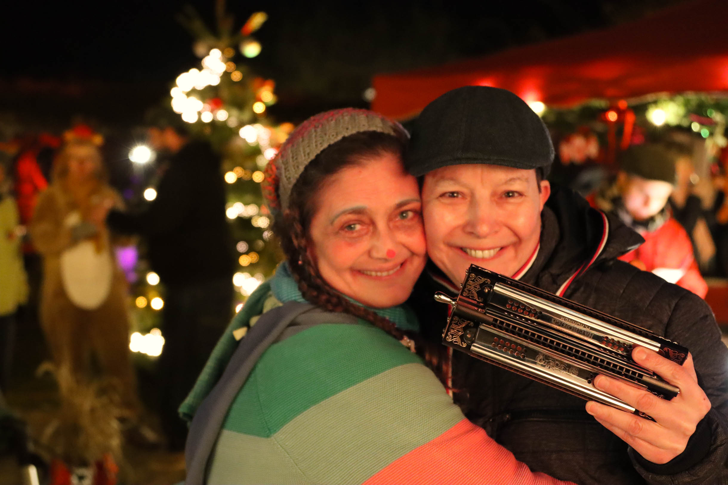Viele Menschen aus den Einrichtungen in der Region und ihre Angehörige waren gekommen, unter anderem auch Sylvia Bzola. Sie begleitete spontan Zauberfee Lilli auf einer sechsseitigen Mundharmonika. Das Spielen auf dem außergewöhnlichen Musik-Instrument habe ihr Vater ihr beigebracht, erzählte sie. Aufwärmen konnten sich die Besucher*innen an einer Feuerschale, für schöne Weihnachtsgeschenke gab es einen Keramikstand. Auch eine Nachbarskatze „verirrte“ sich auf das Gelände und bat sehr erfolgreich um kleine Leckerlies. Besonders die Kinder waren fasziniert von einem jonglierenden Rentier und Alfreds Bunter Ballonwelt, an der Fotobox von Kevin Pratsch (Photobooth-Fun) standen die Gäste Schlange, um ein lustiges Foto mit Rentier-Geweih oder anderen Utensilien zu schießen. Am Glücksrad gab es tolle Preise zu gewinnen, gespendet von den Mitarbeitenden des Seniorenzentrums.