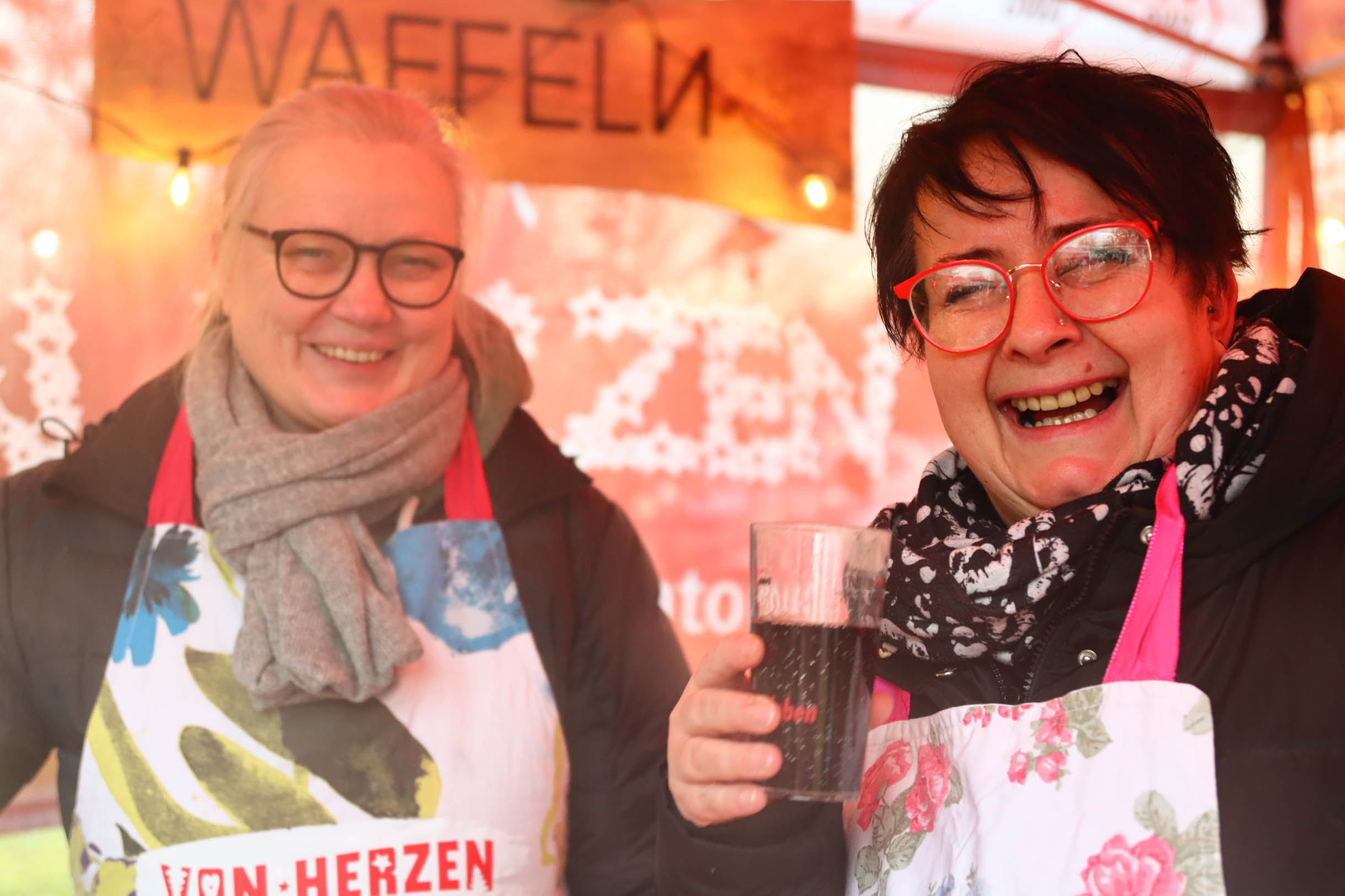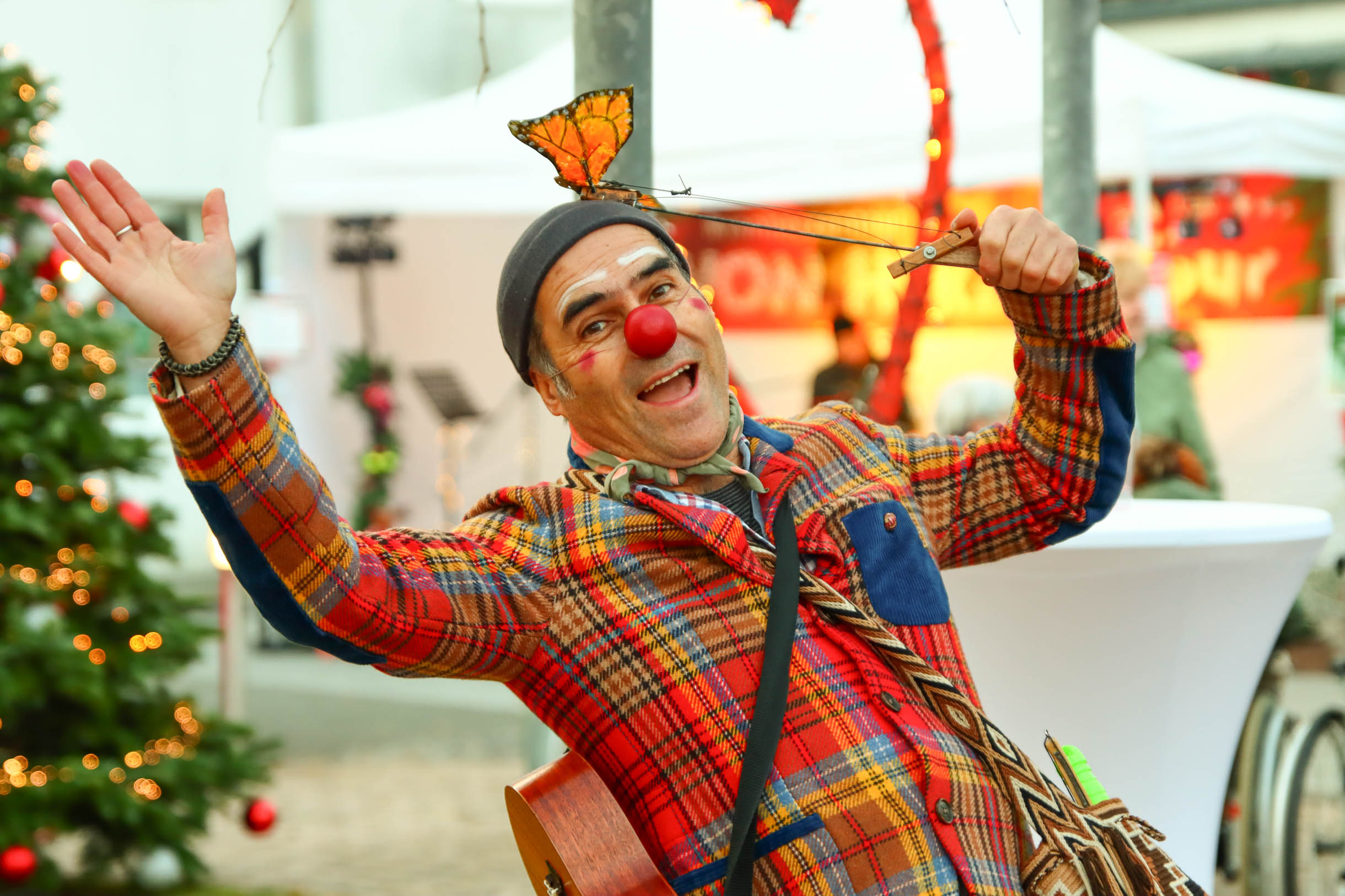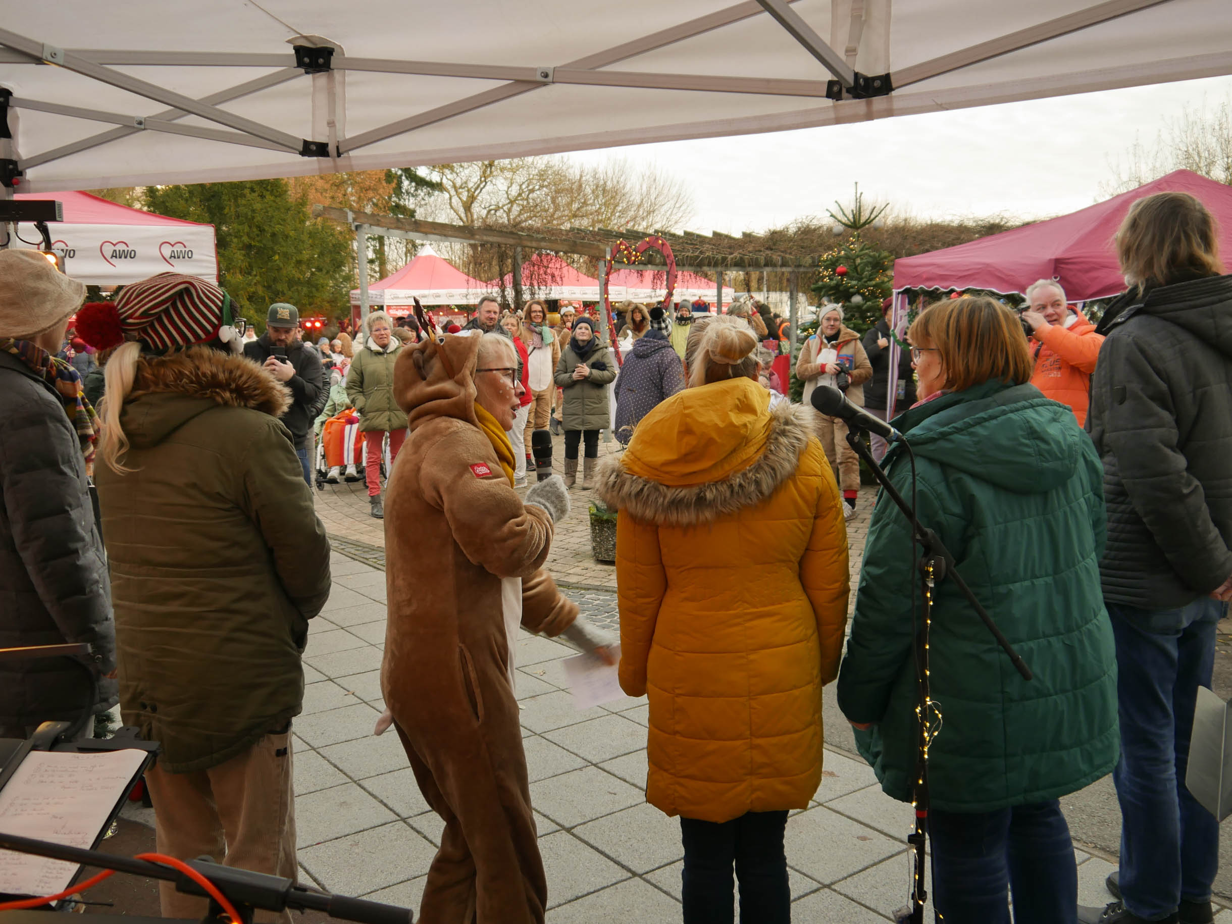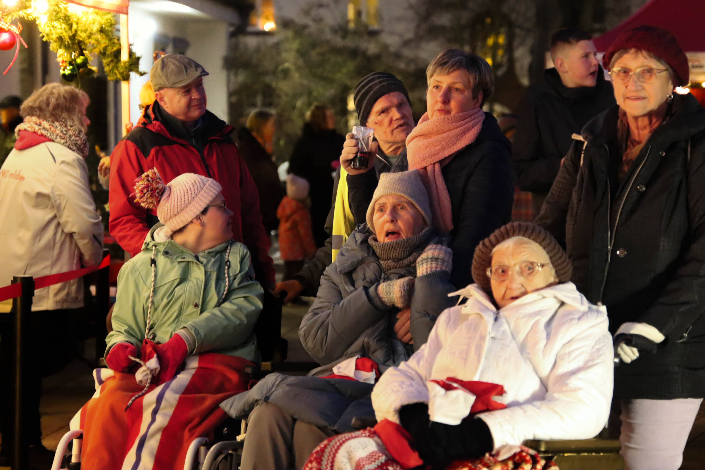 Viele Menschen aus den Einrichtungen in der Region und ihre Angehörige waren gekommen, unter anderem auch Sylvia Bzola. Sie begleitete spontan Zauberfee Lilli auf einer sechsseitigen Mundharmonika. Das Spielen auf dem außergewöhnlichen Musik-Instrument habe ihr Vater ihr beigebracht, erzählte sie. Aufwärmen konnten sich die Besucher*innen an einer Feuerschale, für schöne Weihnachtsgeschenke gab es einen Keramikstand. Auch eine Nachbarskatze „verirrte“ sich auf das Gelände und bat sehr erfolgreich um kleine Leckerlies. Besonders die Kinder waren fasziniert von einem jonglierenden Rentier und Alfreds Bunter Ballonwelt, an der Fotobox von Kevin Pratsch (Photobooth-Fun) standen die Gäste Schlange, um ein lustiges Foto mit Rentier-Geweih oder anderen Utensilien zu schießen. Am Glücksrad gab es tolle Preise zu gewinnen, gespendet von den Mitarbeitenden des Seniorenzentrums.