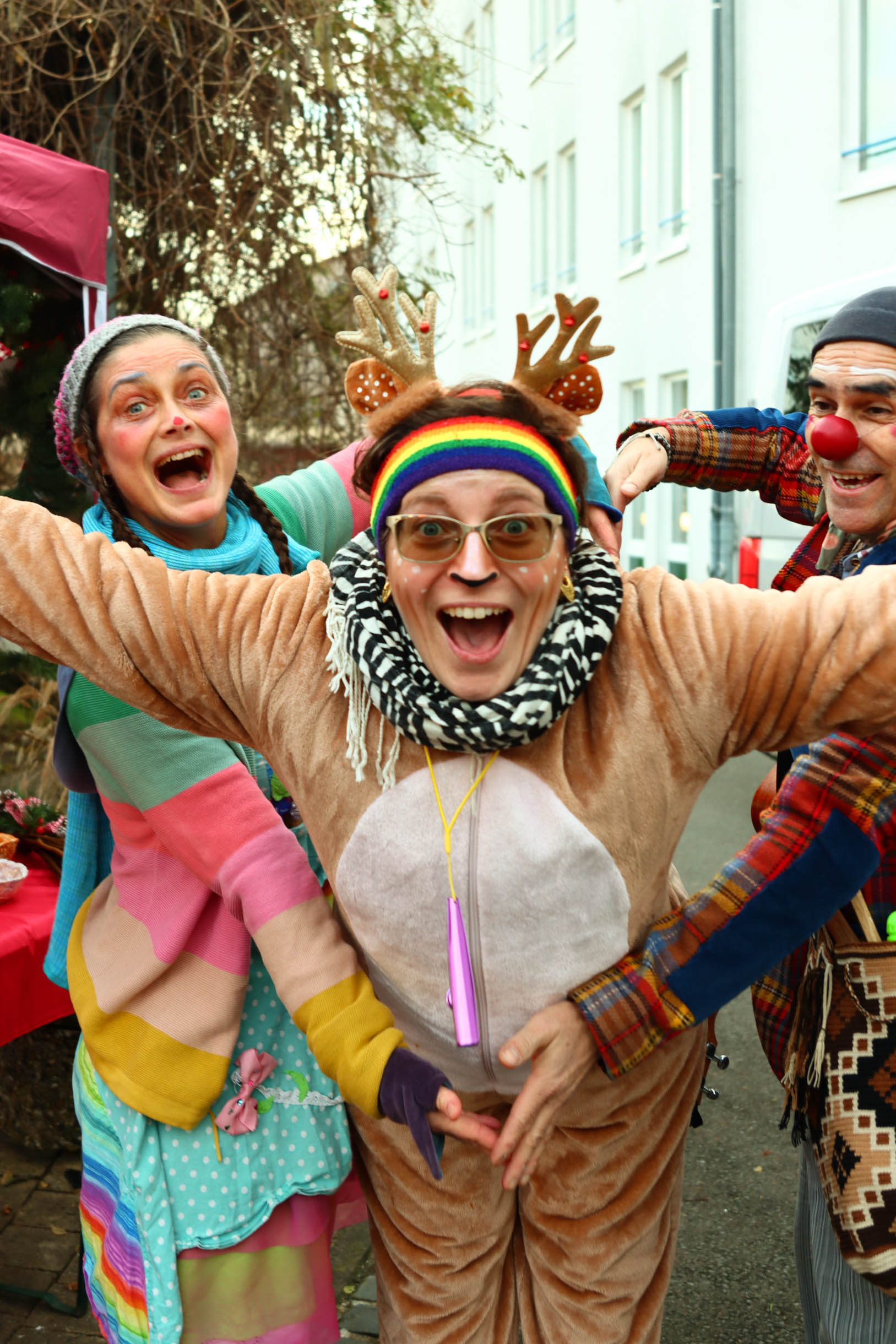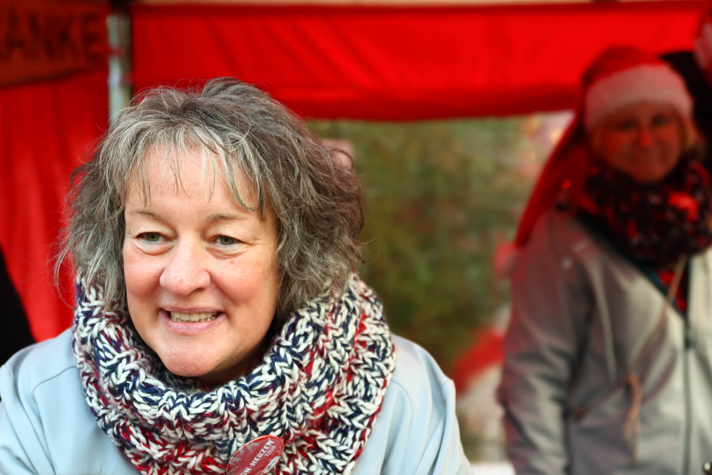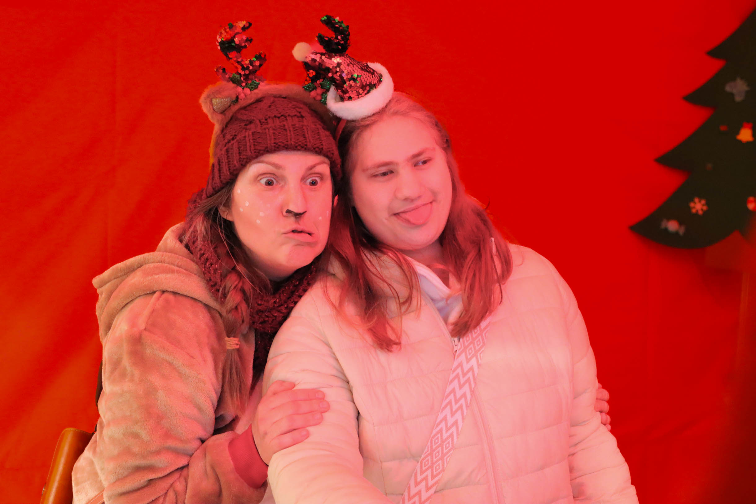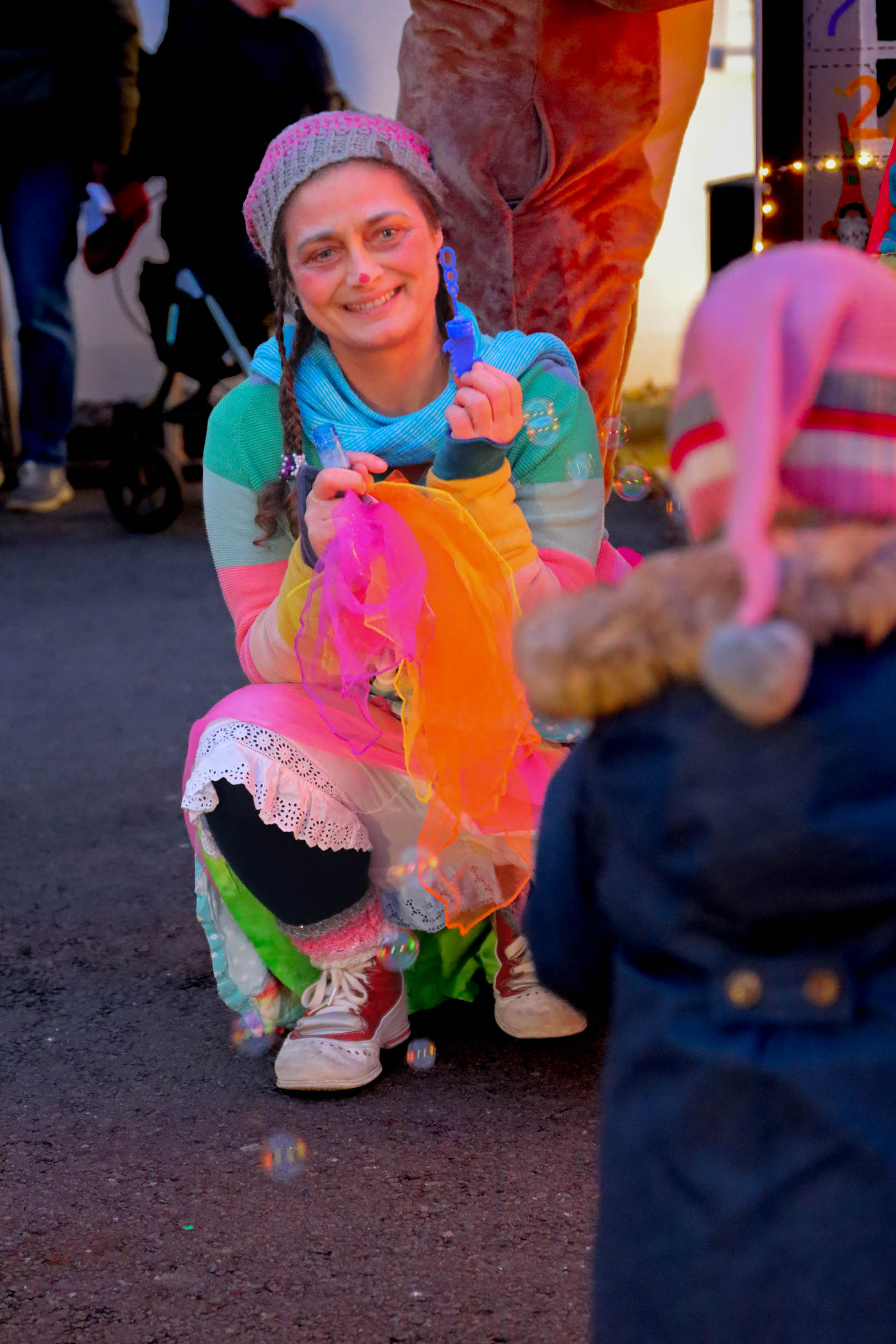 Viele Menschen aus den Einrichtungen in der Region und ihre Angehörige waren gekommen, unter anderem auch Sylvia Bzola. Sie begleitete spontan Zauberfee Lilli auf einer sechsseitigen Mundharmonika. Das Spielen auf dem außergewöhnlichen Musik-Instrument habe ihr Vater ihr beigebracht, erzählte sie. Aufwärmen konnten sich die Besucher*innen an einer Feuerschale, für schöne Weihnachtsgeschenke gab es einen Keramikstand. Auch eine Nachbarskatze „verirrte“ sich auf das Gelände und bat sehr erfolgreich um kleine Leckerlies. Besonders die Kinder waren fasziniert von einem jonglierenden Rentier und Alfreds Bunter Ballonwelt, an der Fotobox von Kevin Pratsch (Photobooth-Fun) standen die Gäste Schlange, um ein lustiges Foto mit Rentier-Geweih oder anderen Utensilien zu schießen. Am Glücksrad gab es tolle Preise zu gewinnen, gespendet von den Mitarbeitenden des Seniorenzentrums.