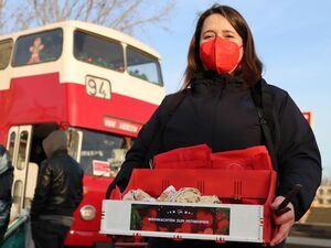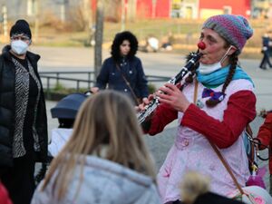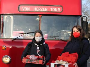 Während vor der AWO Schatztruhe die rund 40 Kinder die Geschenke am liebsten sofort haben wollten und nur unter vollem Einsatz der Clowns des Vereins Lachen Hilft e.V. die Abstände zwischen den Kindern eingehalten wurden, ging es in Drewitz etwas ruhiger zu. Vielleicht lag es auch an unseren Gästen. Außenministerin Annalena Baerbock (Grüne) stieg dort aus dem „VON HERZEN“ – Bus und begrüßte die Kinder und Jugendlichen. „Hallo, ich bin Annalena und reise seit kurzem häufig in andere Länder. Aber heute bin ich hier, um Geschenke zu verteilen“, berichtete sie den Kindern von ihrem neuen Job.